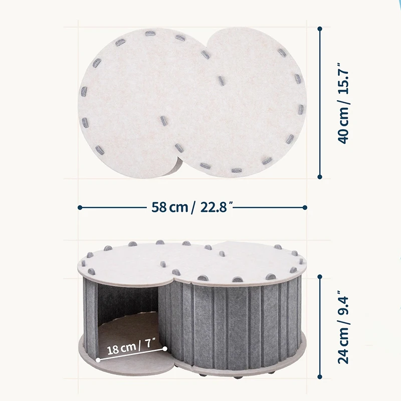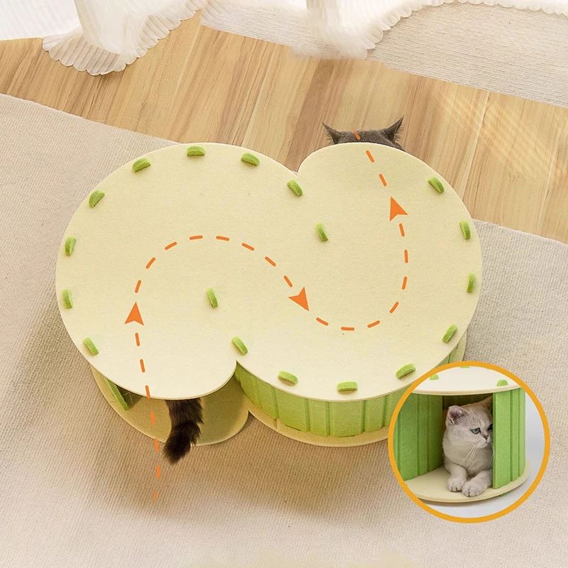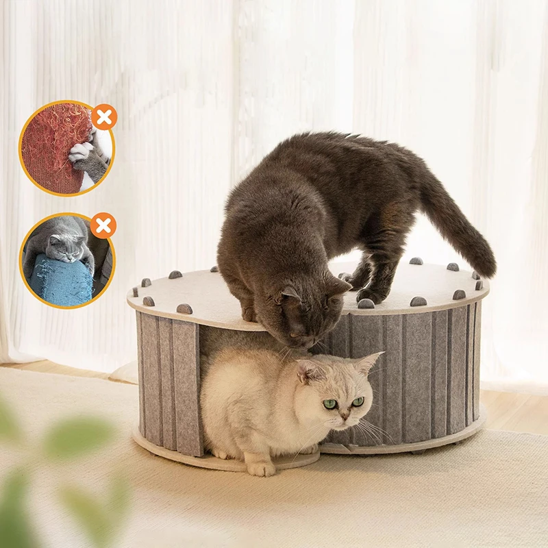 The semi-enclosed design provides a sense of security while allowing airflow, making it a perfect spot for resting and hiding. Made from breathable felt material, it is durable enough for scratching while remaining soft and comfortable.