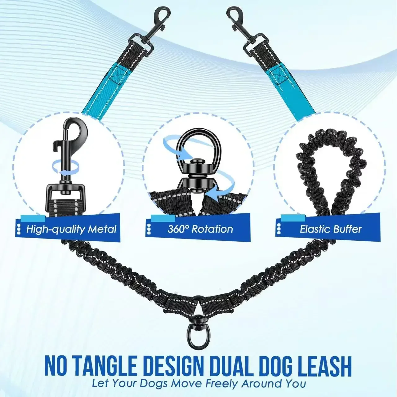 Make walking two dogs easier and safer with this reflective double dog leash featuring two extra traffic handles. Designed for better control and comfort, it allows you to manage both dogs at the same time without tangling. The 360° swivel connector ensures smooth movement and prevents twisting, while the shock-absorbing bungee section reduces strain from sudden pulling. Dual traffic handles give you quick control in crowded areas or near roads for added safety.